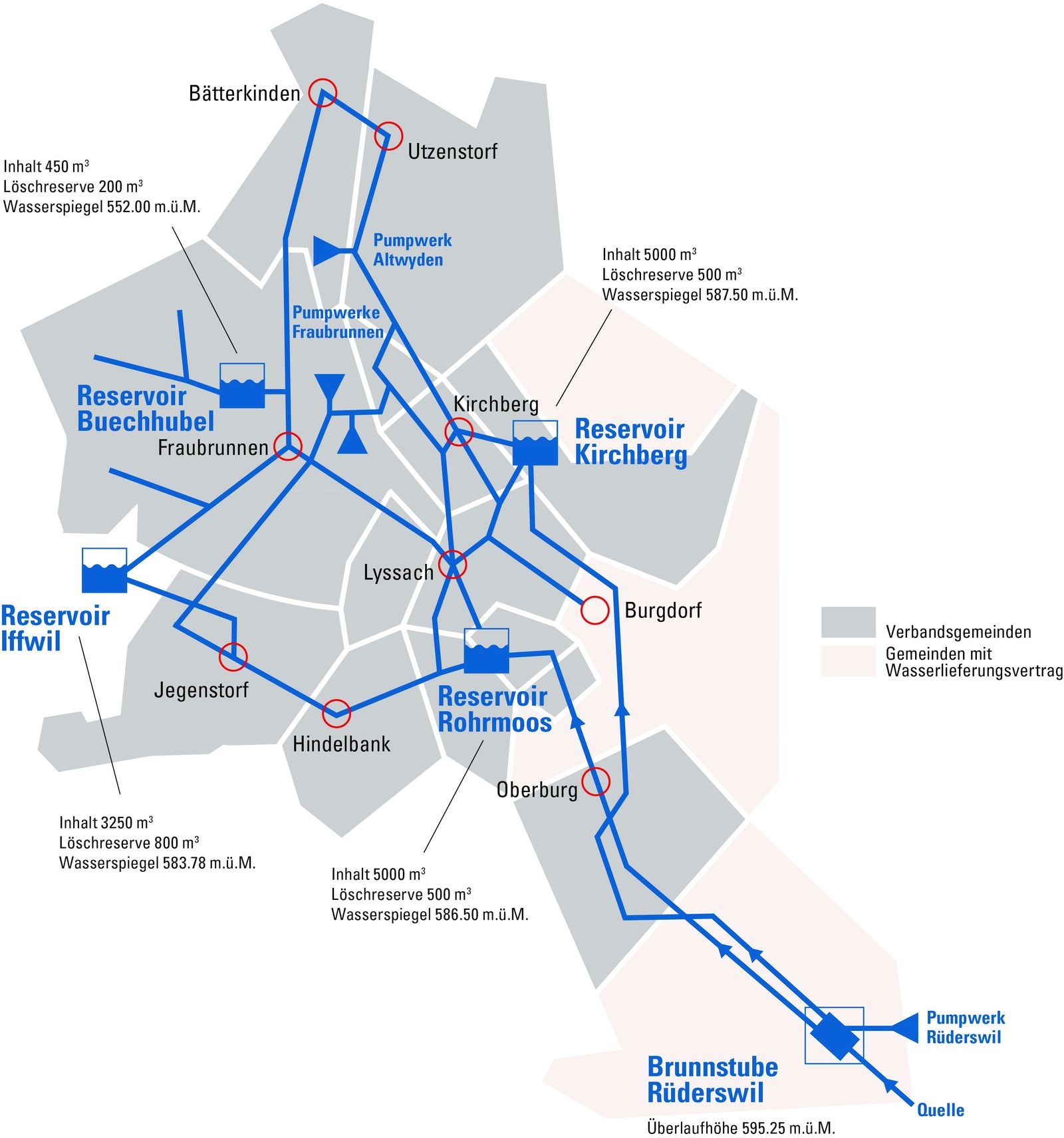 Emmental Trinkwasser arbeitet mit einer Druckstufe und besitzt fünf Reservoire in Kirchberg, Rohrmoos, Iffwil und Fraubrunnen. Das Quellwasser aus Rüderswil fliesst direkt über zwei Transportleitungen in die Reservoire in Kirchberg und Rohrmoos. Durch den hydrostatischen Druckausgleich im Verteilnetz füllen sich auch die beiden Reservoire in Iffwil und das Reservoire Fraubrunnen gleichmässig auf. Die Pumpwerke in Fraubrunnen und Aldwyden speisen das Wasser direkt ins Verteilnetz ein, wobei der Überschuss in den Reservoiren zurückbehalten wird.